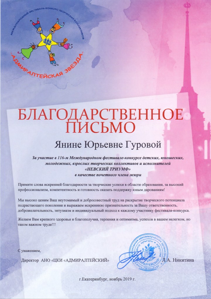 Член жюри Международного фестиваля-конкурса детских, юношеских, молодежных, взрослых творческих коллективов и исполнителей «Невский триумф». 22–25 ноября 2019 г., Екатеринбург, Россия.