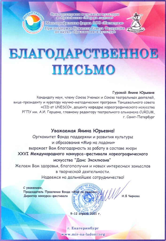 Член жюри Всероссийского фестиваль–конкурса хореографического искусства «Данс Эксклюзив». 9–12 апреля 2021. Г. Екатеринбург.