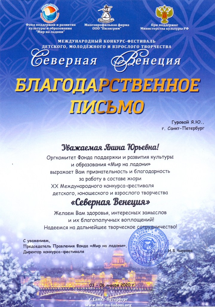 Член жюри ХХ Международного конкурса–фестиваля детского, юношеского и взрослого творчества «Северная Венеция». 4 января 2020 г., Санкт-Петербург, Россия.