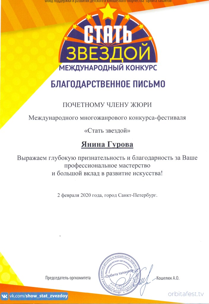 Почетный Член жюри Международного конкурса «Стать звездой». 2 февраля 2020 г. Санкт–Петербург, Россия.