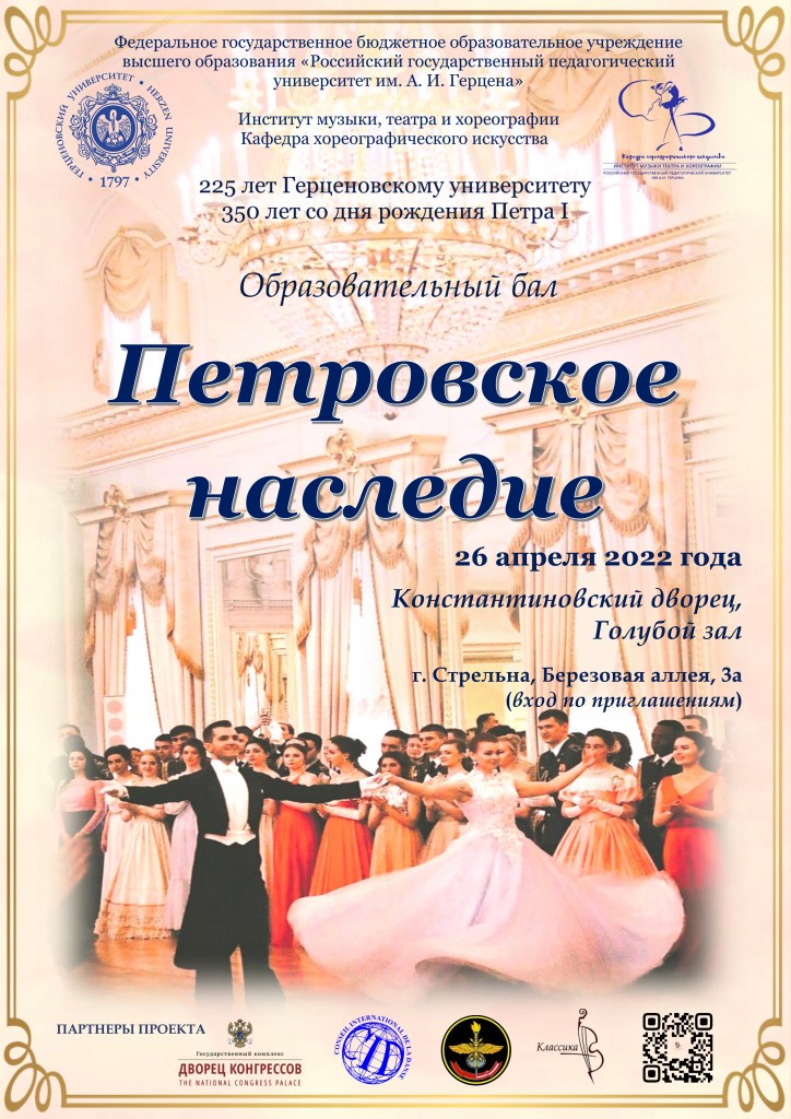 В текущем году образовательный бал «Петровское наследие» прошел уже в третий раз, традиционно в Голубом зале Константиновского дворца Санкт-Петербурга. Студенты кафедры хореографического искусства РГПУ им. А. И. Герцена (заведующая кафедрой доктор педагогических наук, профессор Л. А. Касиманова) и курсанты специального факультета Военной академии связи им. Маршала Советского Союза С. М. Будённого исполнили серию головокружительных исторических танцев, приуроченных к 350-летию со дня рождения Петра I и 225-летию со дня основания крупнейшего педагогического университета.